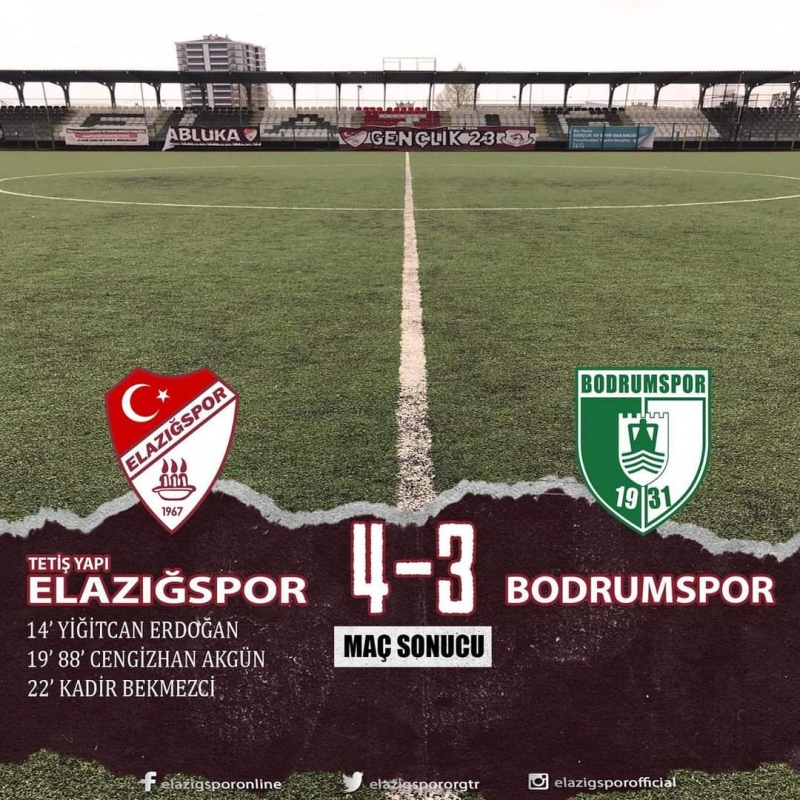 Karşılaşmanın 14.19 ve 22. dakikalarında Temsilcimiz Elazığspor un bulduğu goller ile 3-0 öne geçti. 26.dk ise Bodrumspor skoru 3-1 yaptı.ilk yarı 3-1 sona erdi.