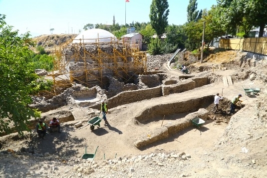 Bu kapsamda Harput’un girişinde bulunan yüksek ve görkemli kubbesiyle dikkat çeken 387 yıllık tarihi Hoca Hasan Hamamı’nda başlatılan kazı çalışmaları sürdürülüyor.