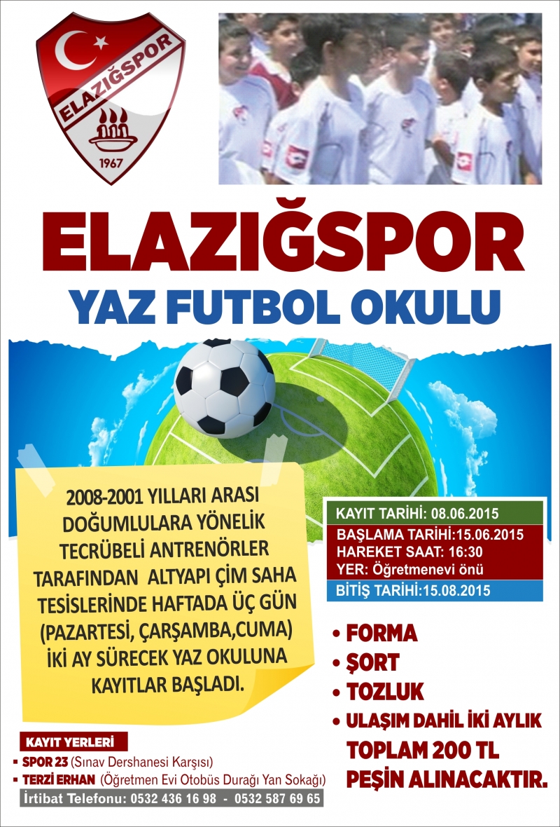 Elazığspor Tesisleri’nde 15 Haziran Pazartesi günü saat 17.30’da başlayacak olan Yaz Futbol Okulu’nda Pazartesi, Çarşamba ve Cuma günleri eğitim verilecek.