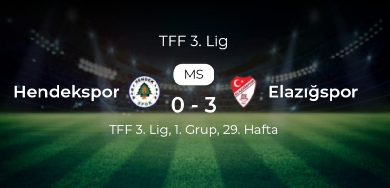 TFF 3. Lig 1. Grubun 29. Haftasında Temsilcimiz Elazığspor Hendekspor’a konuk oldu. Sakarya’da gerçekleşen karşılaşmayı Şanlıurfa Bölgesi Hakemlerinden Mikail Cihangir yönetti. Elazığspor için kritik olan karşılaşmanın ilk golünü 16. Dakikada penaltıdan Ömer Faruk, ikinci golünü 30. Dakikada Yusuf Ensar ve üçüncü golünü ise 90. Dakikada penaltıdan Feyzullah kaydetti. Karşılaşma Elazığspor’un 3-0 galibiyeti ile sonuçlandı.